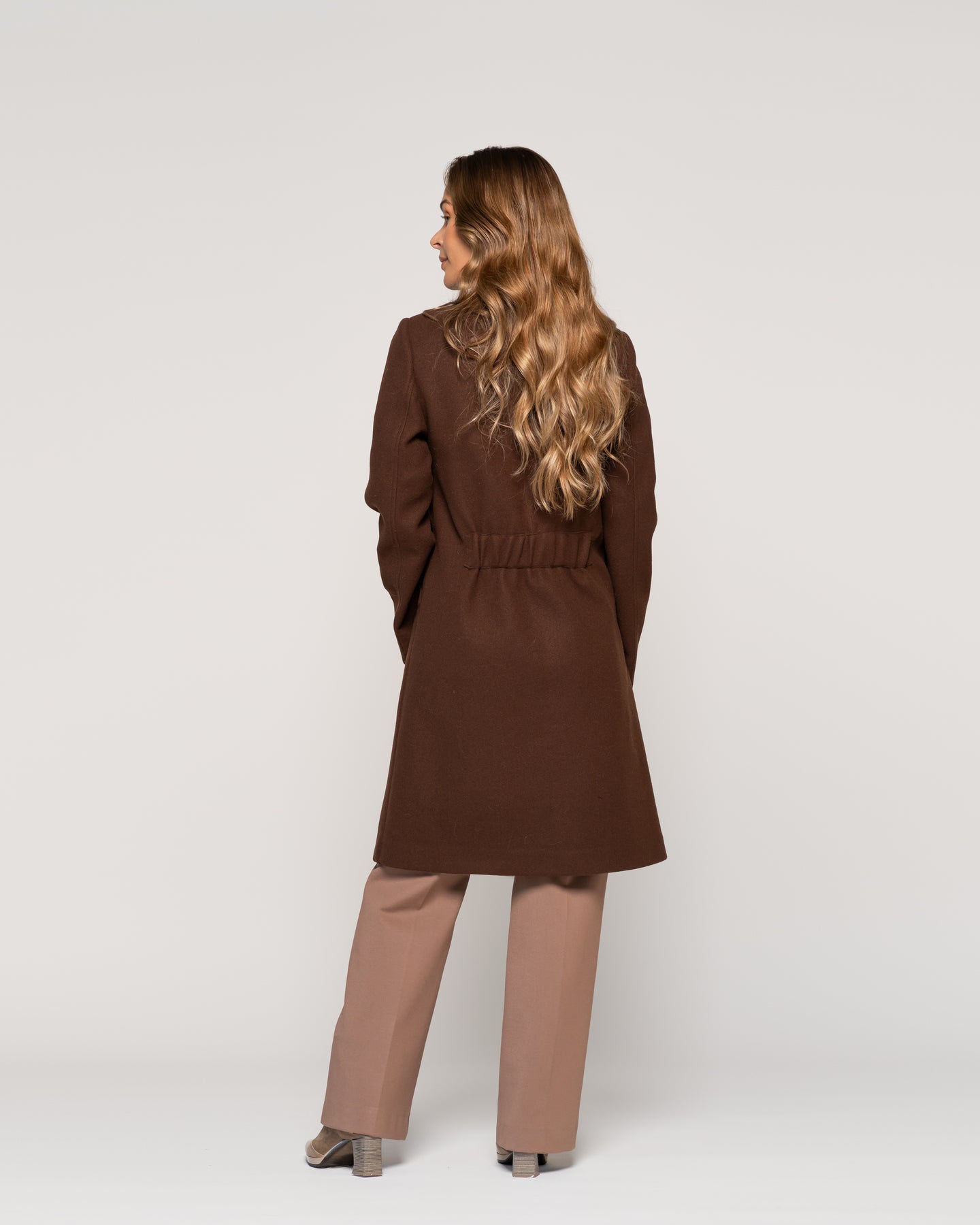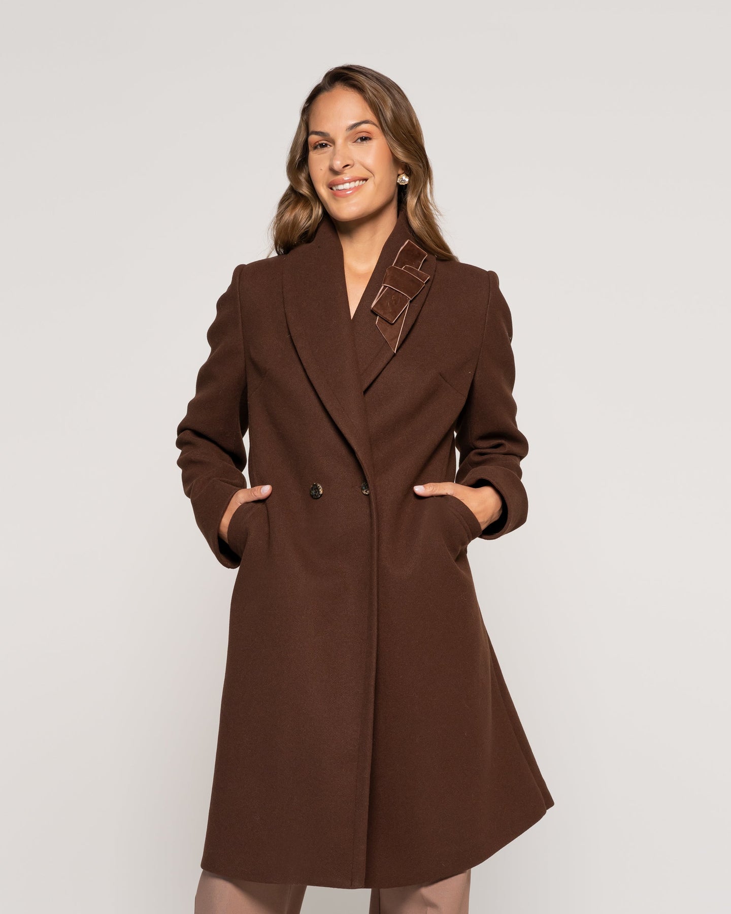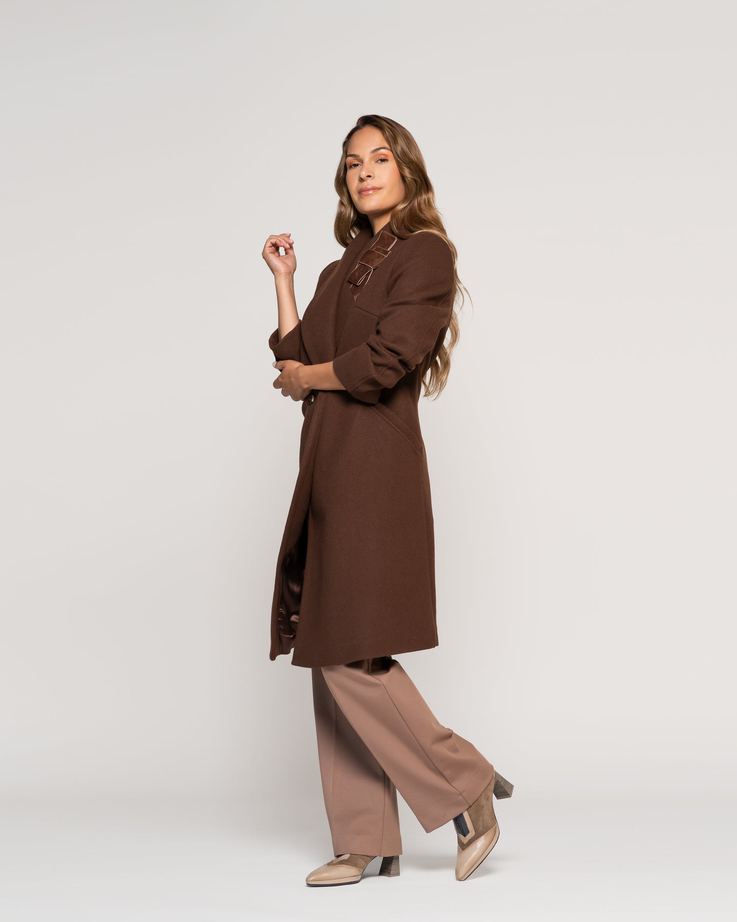 Abrigo en tono café. Diseño evasé de largo sobre rodilla con solapa amplia envolvente y cierre frontal limpio que estiliza la silueta con elegancia contemporánea. Con bolsillos laterales y detalle geométrico en la solapa que aporta carácter, ideal para estilismos sofisticados de la colección CROMA Otoño Invierno 2026.