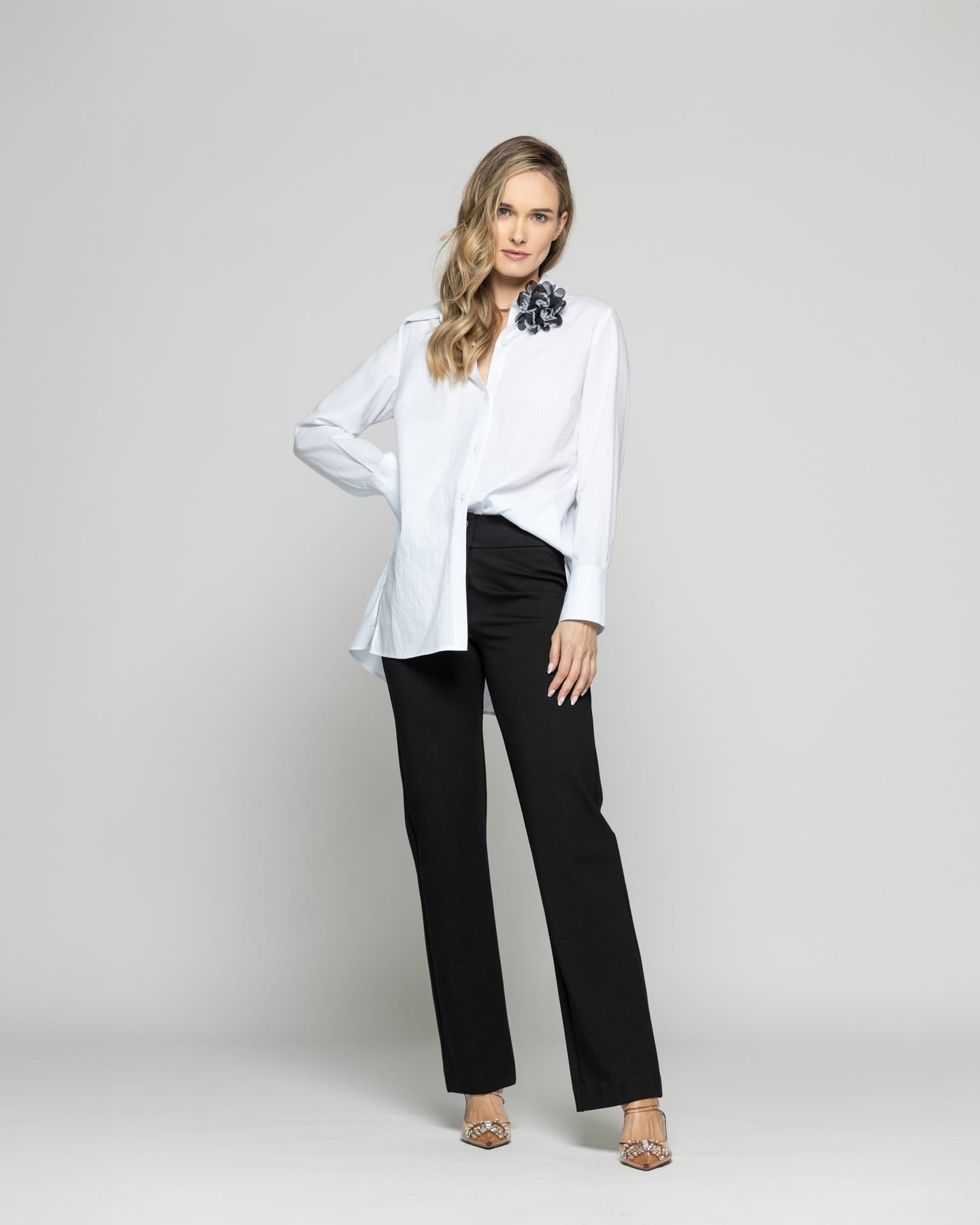 Una reinterpretación moderna de la camisa clásica. Este diseño está confeccionado 100% en algodón lo que la hace una prenda fresca para la temporada de primavera verano. El detalle floral desmontable en el hombro eleva la prenda con un gesto femenino y expresivo, ideal para marcar presencia con sutileza. Las mangas largas con puños amplios y el largo extendido permiten jugar con distintas formas de uso: abierta, cerrada o semi fajada. Una camisa versátil que combina estructura, suavidad y un toque inesperado.