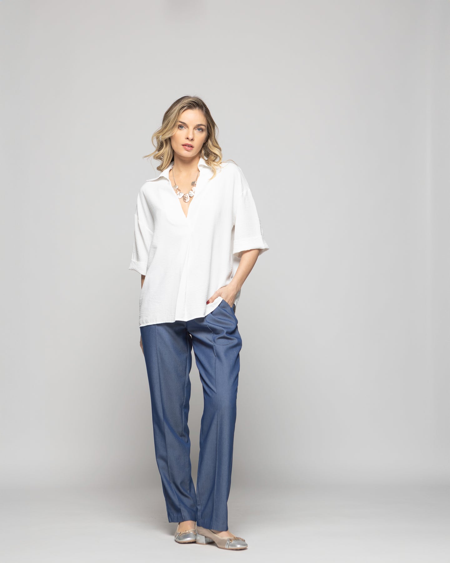 Una prenda que encarna la elegancia relajada. Esta blusa de manga amplia y escote en V profundo es perfecta para quienes buscan comodidad sin sacrificar estilo. El cuello abierto y estructurado añade un toque sofisticado que equilibra la fluidez del tejido y el calce suelto. Su diseño versátil permite múltiples combinaciones: con pantalones de vestir para un look más pulido, o con denim o lino para un aire casual chic. La tela liviana y de textura sutil la convierte en un esencial de temporada, ideal para transitar entre climas y ocasiones con naturalidad. Una pieza simple, pero con carácter.