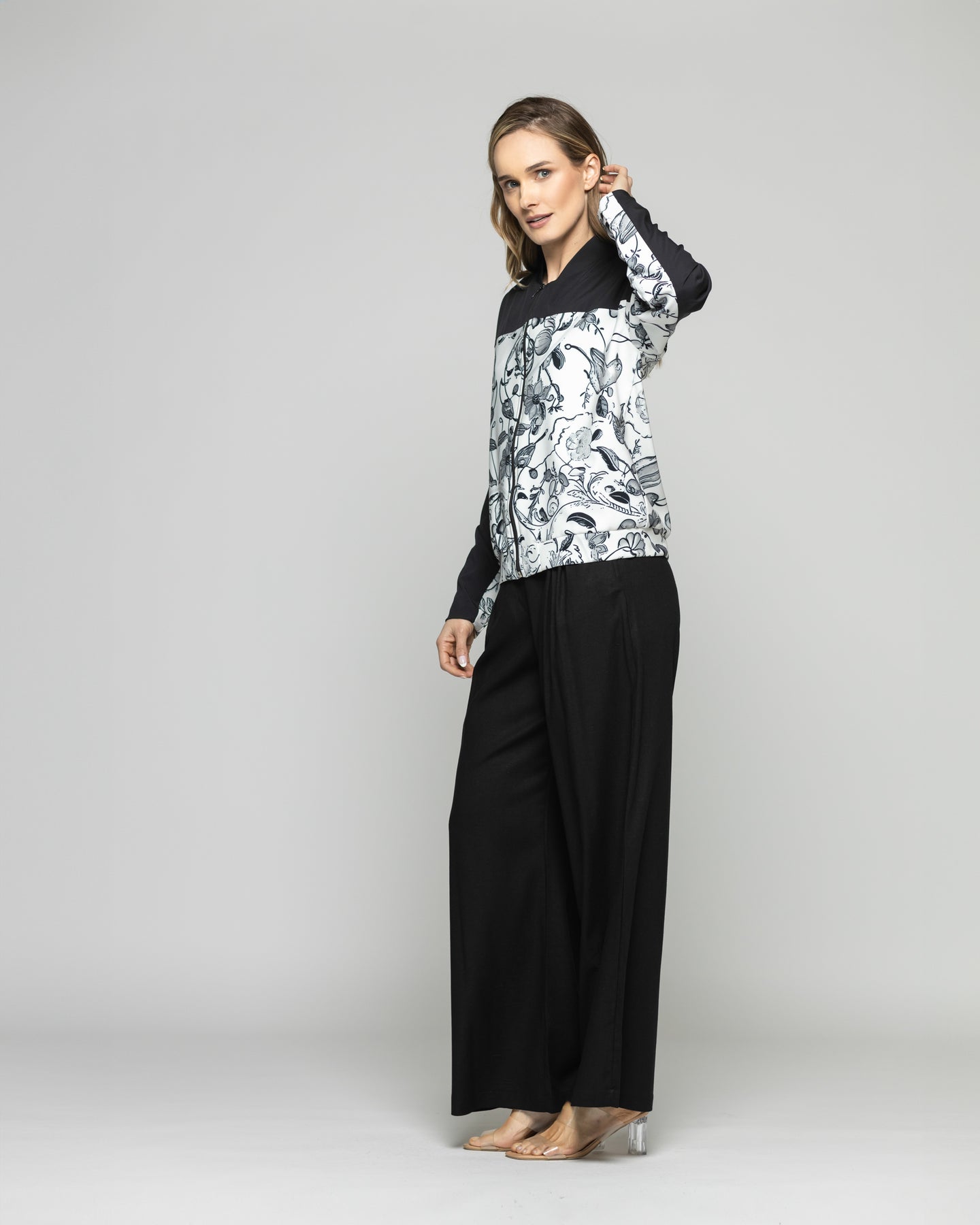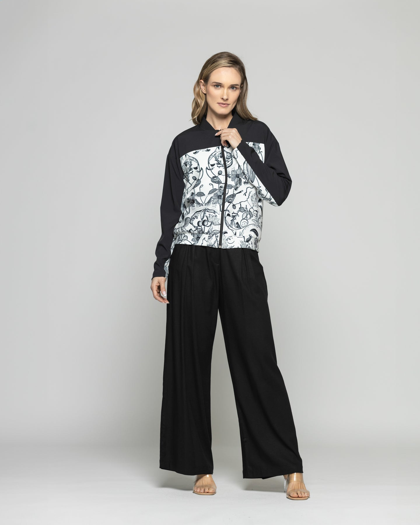 Una fusión entre lo artístico y lo urbano. Esta chaqueta tipo bomber combina un panel frontal con ilustraciones botánicas en blanco y negro, con bloques lisos en negro profundo que enmarcan el diseño con sobriedad. El cierre frontal y los puños relajados le dan un aire deportivo, ideal para estilismos casuales con un giro sofisticado. Perfecta para combinar con pantalones sastre, denim o incluso faldas midi, esta prenda es el equilibrio justo entre comodidad y carácter gráfico. Especial para el cambio de temporada primavera verano.