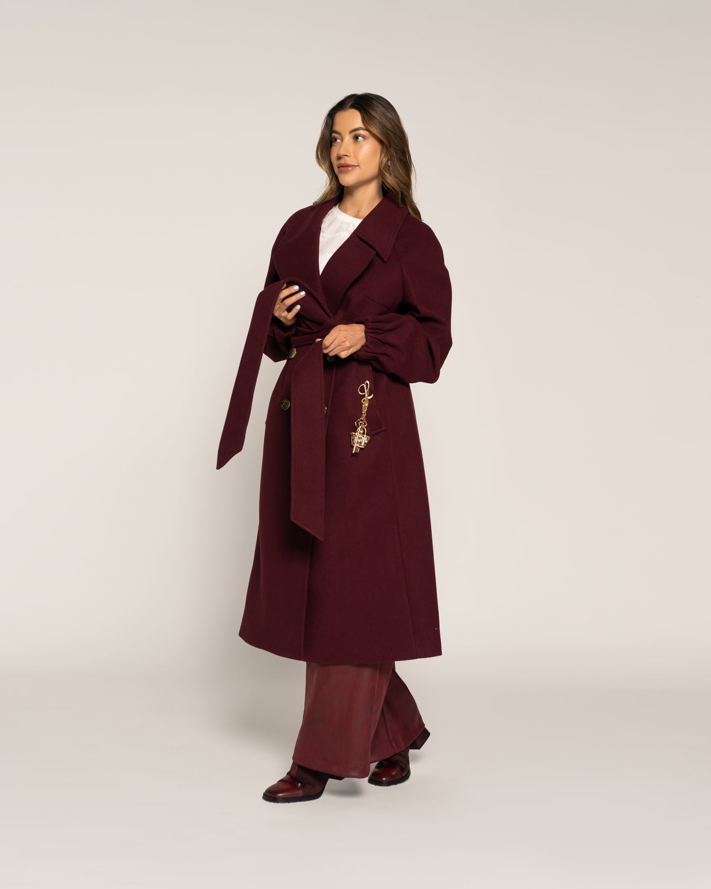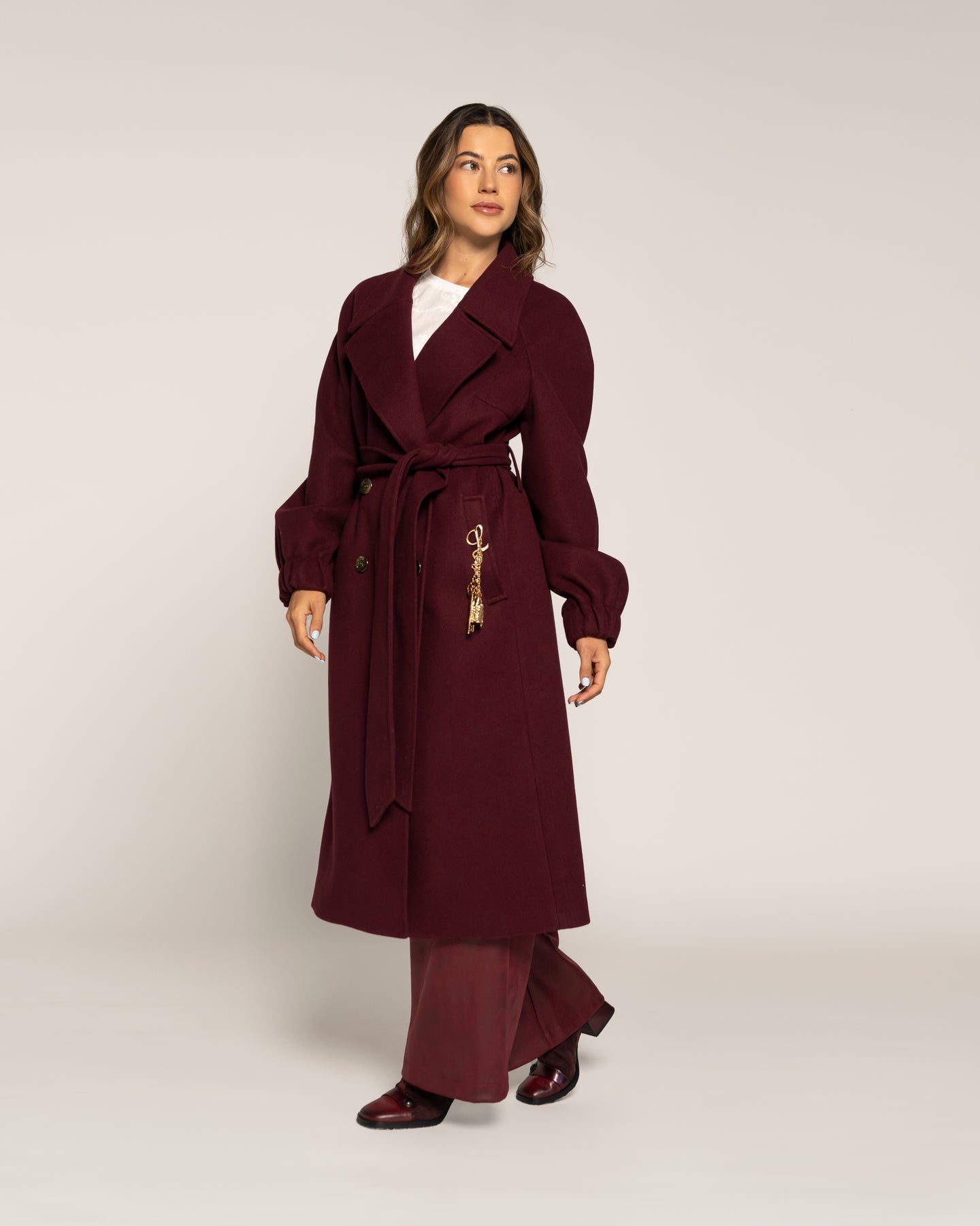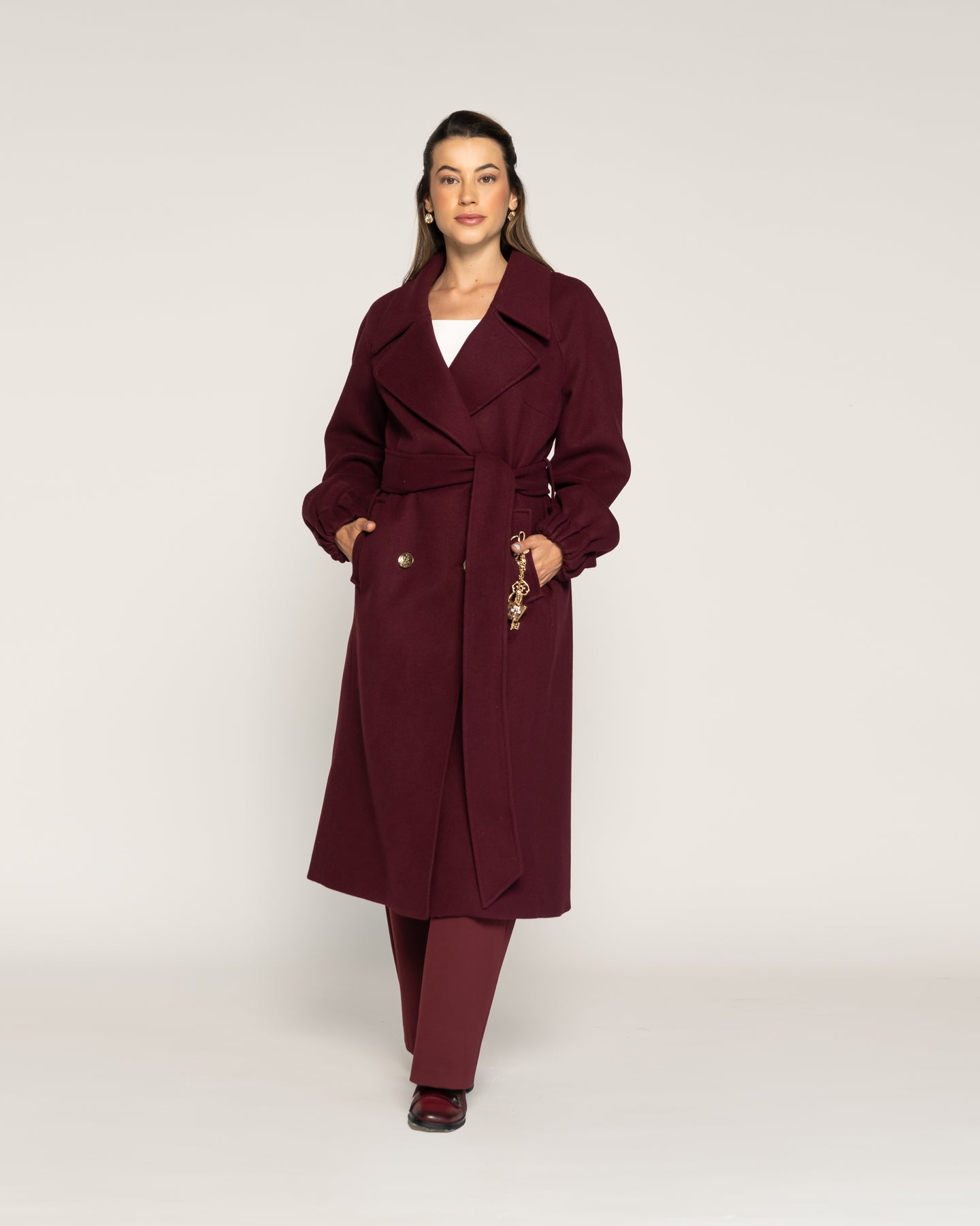 Abrigo en tono Vino. Diseño cruzado de largo midi con doble botonadura frontal y cinturón del mismo tejido que define la silueta con elegancia. Con solapa amplia, bolsillos laterales y mangas rectas con leve volumen en puño, ideal para estilismos sofisticados de la colección CROMA Otoño Invierno 2026.Tipo: Abrigo cruzadoColor: VinoLargo: MidiCuello: Solapa ampliaCierre: Cruzado con cinturón y doble botonaduraBolsillos: LateralesManga: Recta con leve volumenEstilo: Elegante envolvente