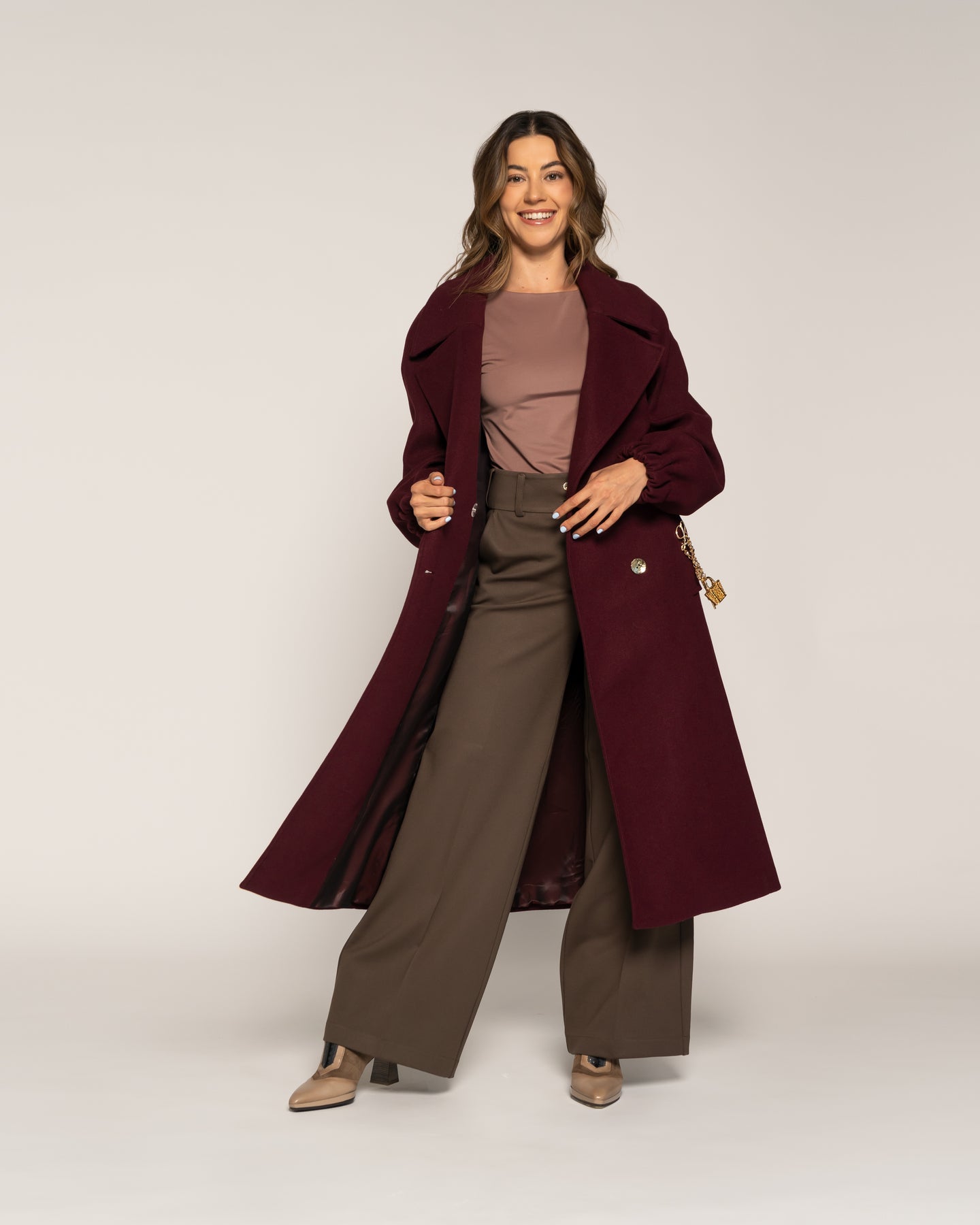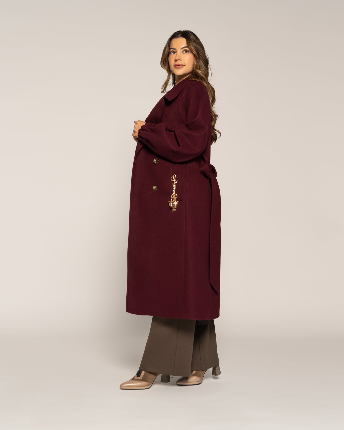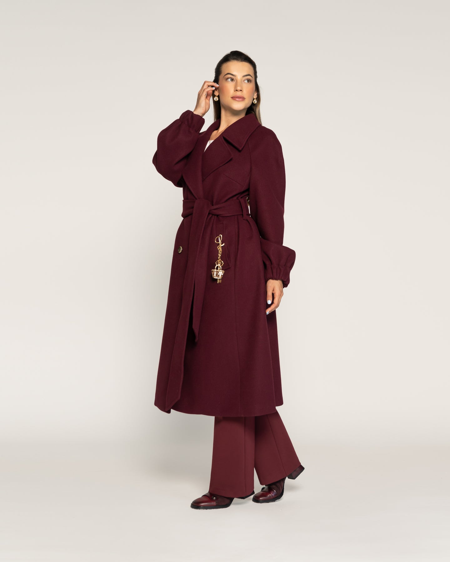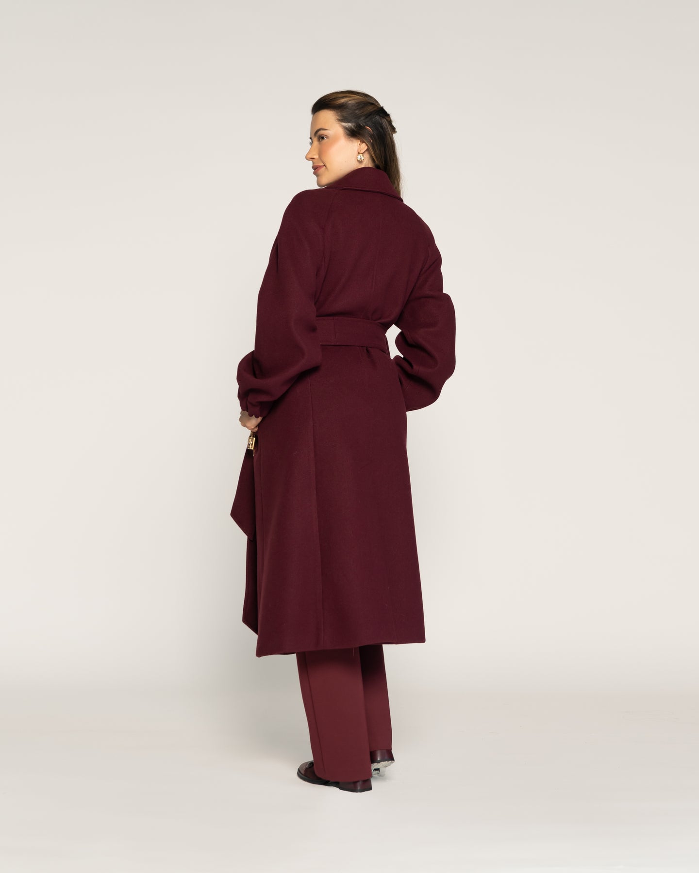 Abrigo en tono Vino. Diseño cruzado de largo midi con doble botonadura frontal y cinturón del mismo tejido que define la silueta con elegancia. Con solapa amplia, bolsillos laterales y mangas rectas con leve volumen en puño, ideal para estilismos sofisticados de la colección CROMA Otoño Invierno 2026.Tipo: Abrigo cruzadoColor: VinoLargo: MidiCuello: Solapa ampliaCierre: Cruzado con cinturón y doble botonaduraBolsillos: LateralesManga: Recta con leve volumenEstilo: Elegante envolvente