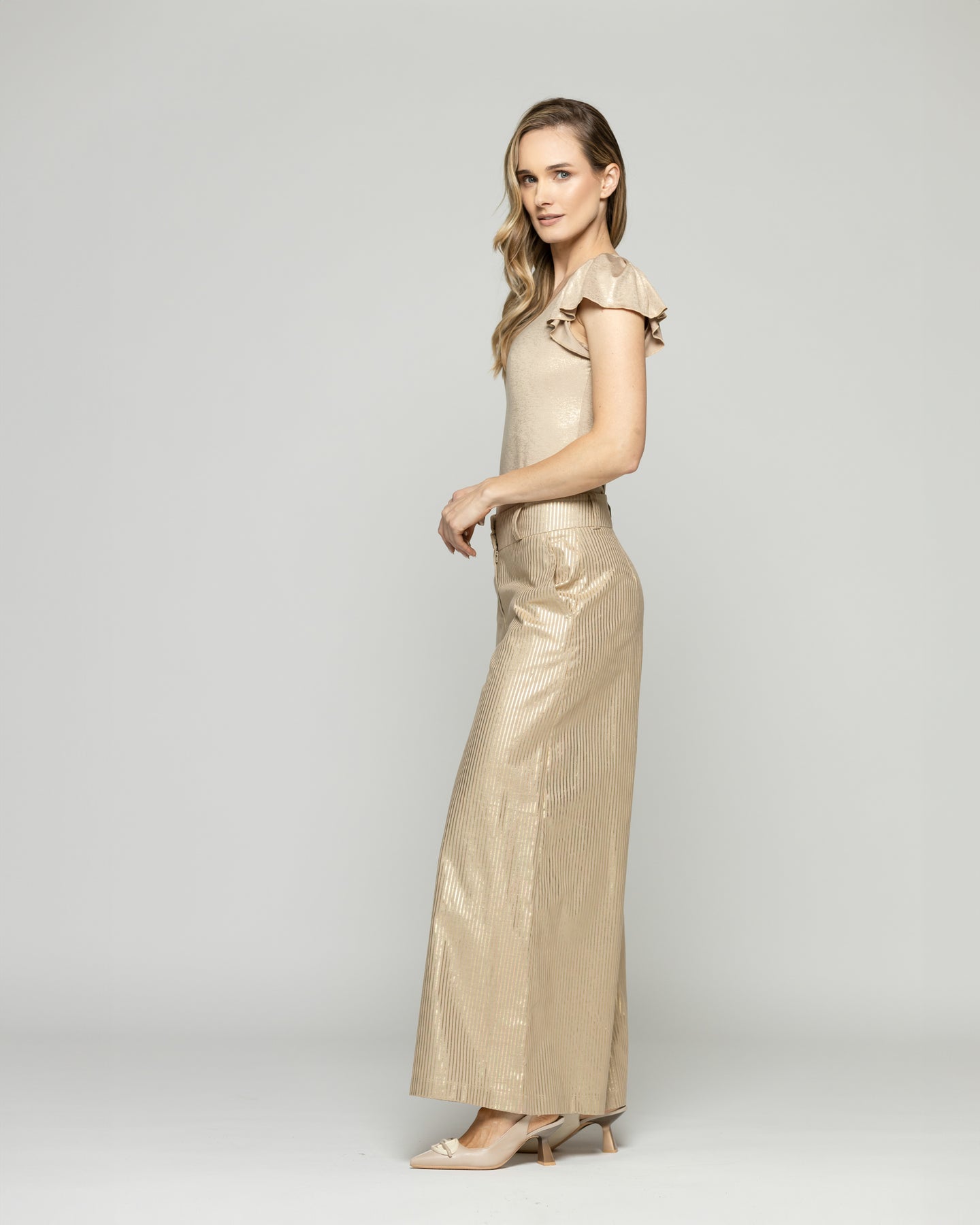 Este pantalón es una declaración de estilo con alma festiva. Su acabado metalizado de pequeñas lineas capta la luz en cada movimiento, aportando un brillo sutil y elegante. De calce amplio y tiro alto, su silueta fluida estiliza y alarga las piernas, mientras que su confección con pretina estructurada y cierre oculto garantiza un ajuste cómodo y sofisticado. Ideal para elevar cualquier look de noche o transformar un outfit de día con un toque glam, este pantalón se convierte en protagonista con tan solo añadir una blusa neutra o una chaqueta de cuero. Completa el look con su blazer corto o largo clásico.