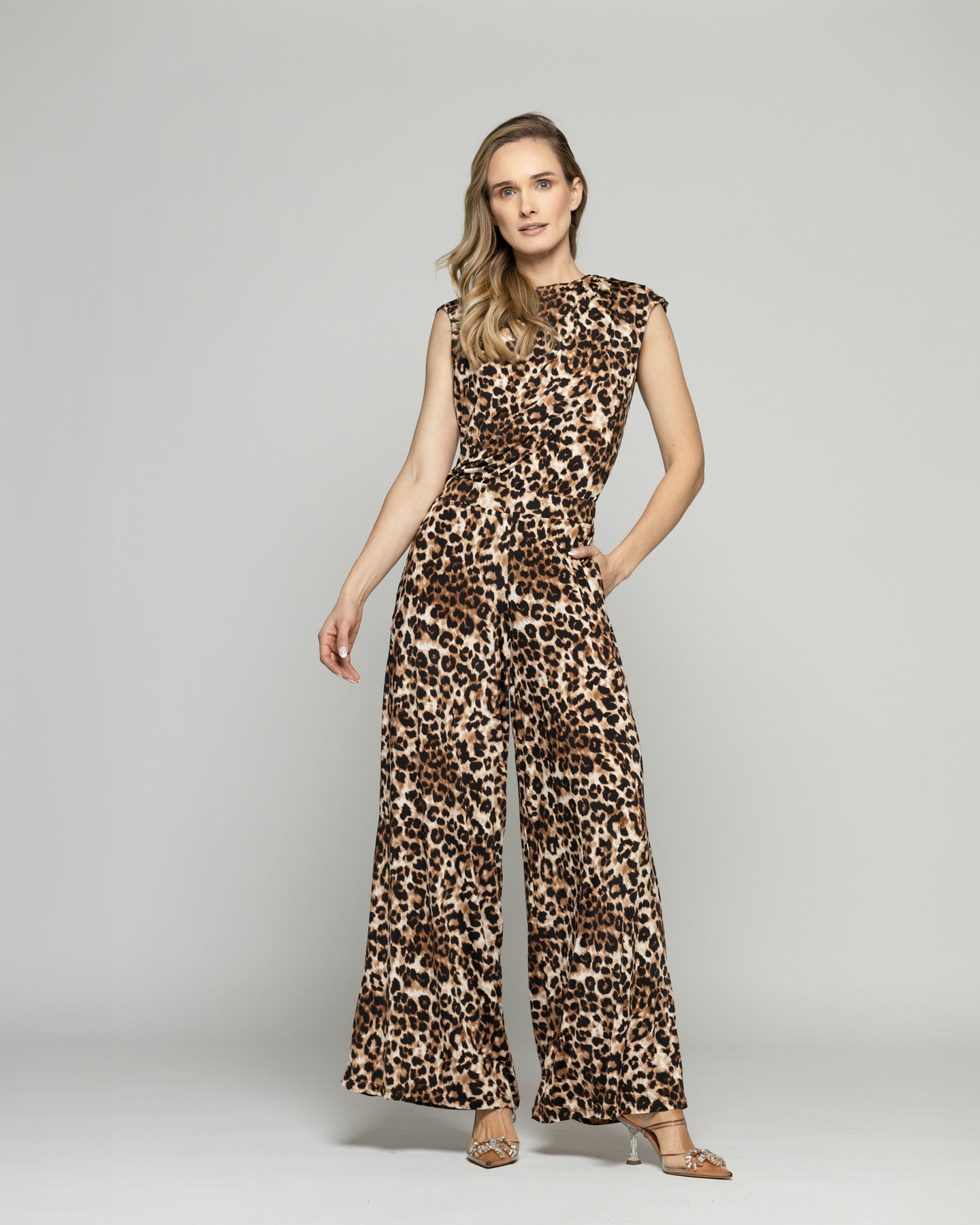 Este pantalón palazzo con estampado animal es una declaración de estilo con carácter. Su silueta amplia y fluida aporta movimiento y elegancia, mientras que el print tipo leopardo le entrega un aire audaz, ideal para quienes buscan destacar sin esfuerzo. Confeccionado en una tela suave de excelente caída, combina comodidad y sofisticación. Úsalo con su top a juego para un conjunto impactante, o con prendas neutras para equilibrar el look. Perfecto para cenas, eventos o para elevar un día cualquiera con actitud y seguridad. Una prenda que no pasa desapercibida.