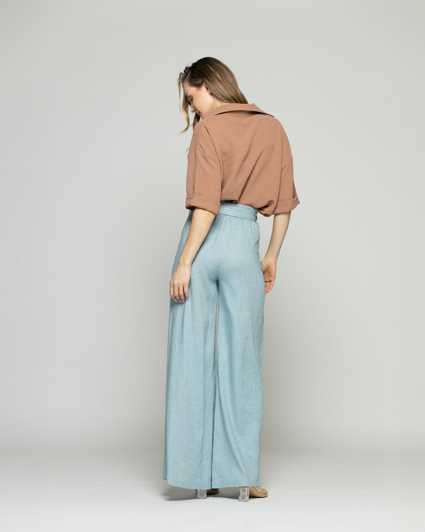 Este pantalón tipo palazzo combina elegancia y comodidad en una silueta de piernas anchas que cae suavemente desde la cintura hasta el suelo. Confeccionado en un tejido liviano y con una textura sutil, aporta fluidez y movimiento en cada paso. El diseño incluye un cinturón anudado en el mismo tono y material, que permite ajustar la prenda con delicadeza al contorno de la cintura, creando un efecto favorecedor y femenino. Su estilo versátil lo hace ideal para outfits formales si se combina con blusas estructuradas, o para looks más relajados con prendas de punto o algodones livianos. Un imprescindible para quienes buscan sofisticación sin sacrificar confort.