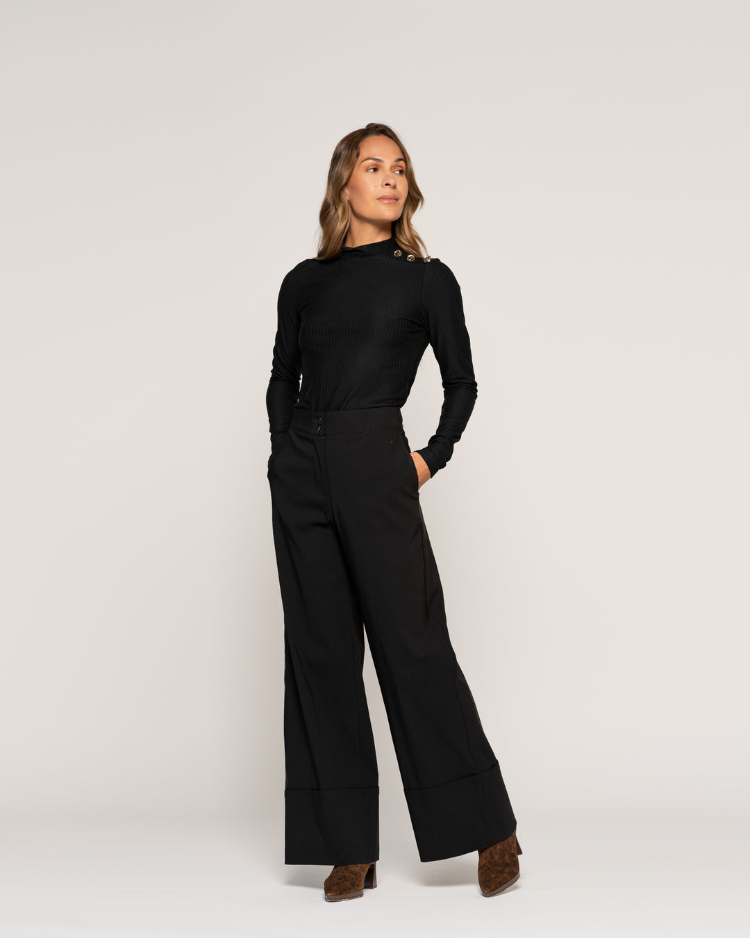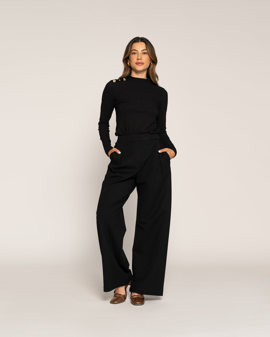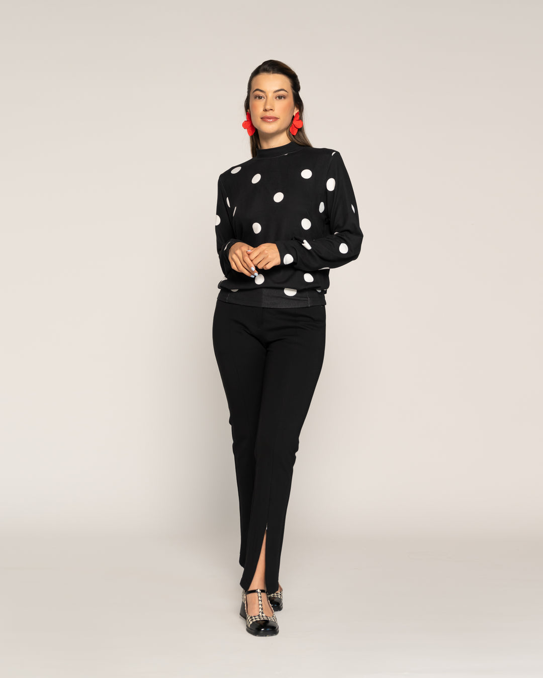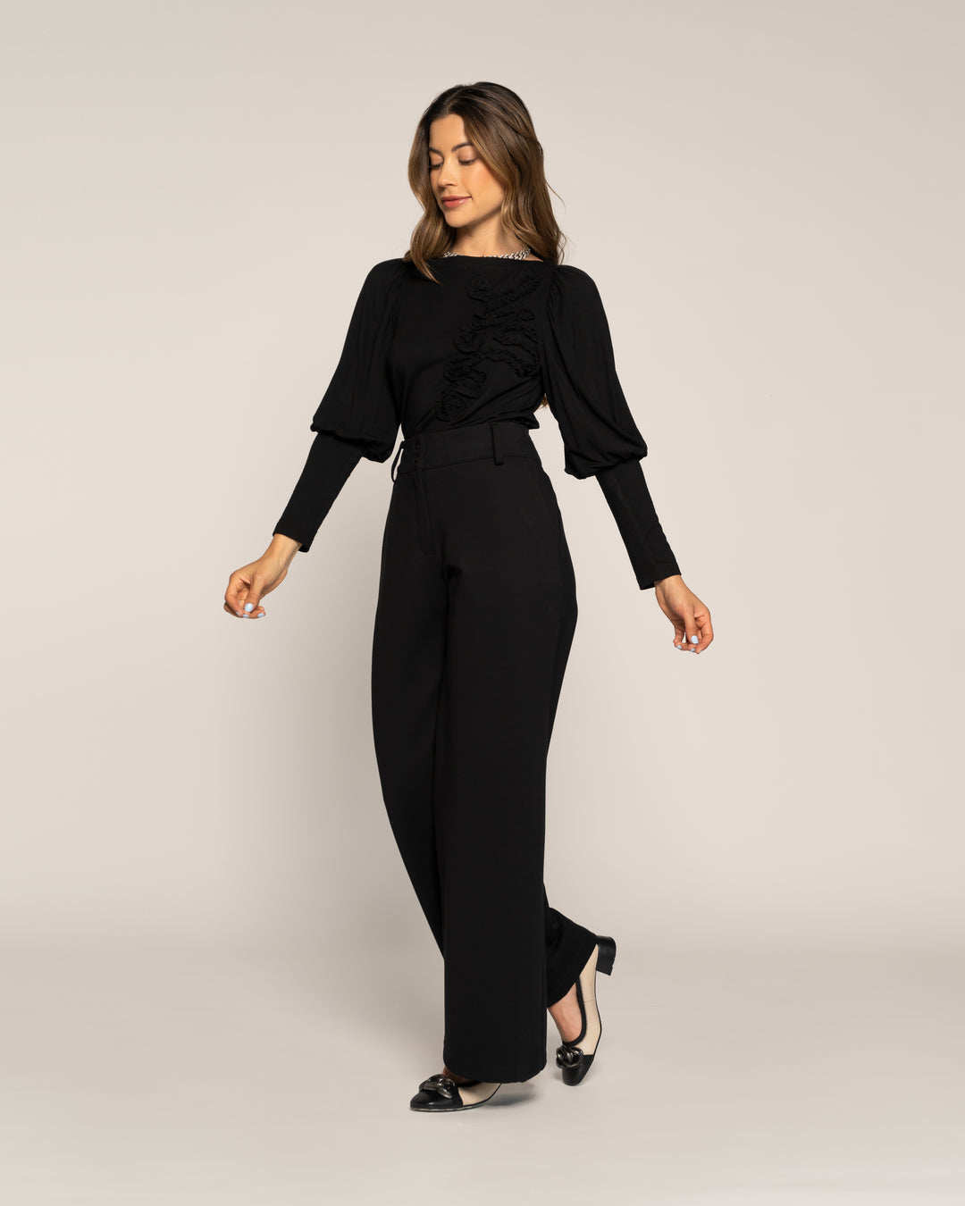 Polera Eliana Negro Cuello medio alto Manga larga Globo Puño elasticado Mujer