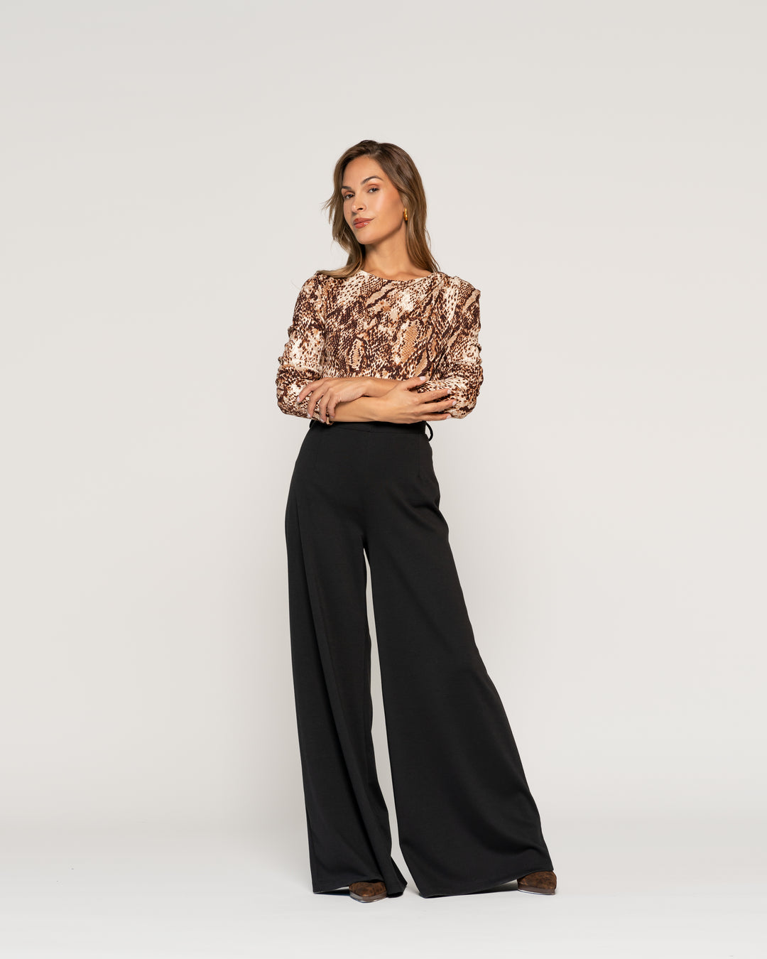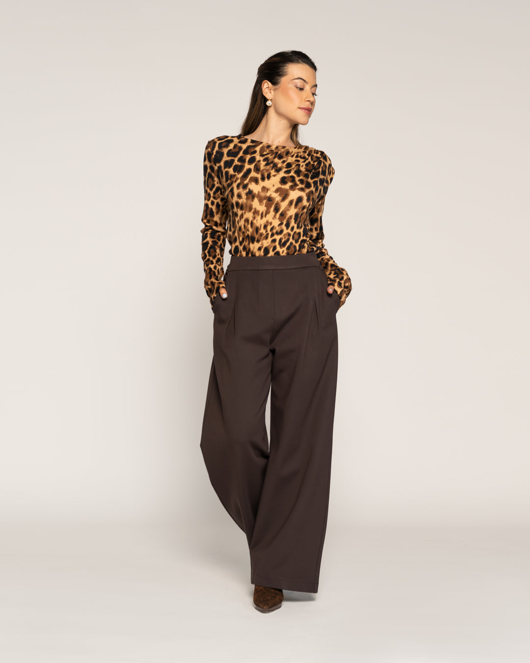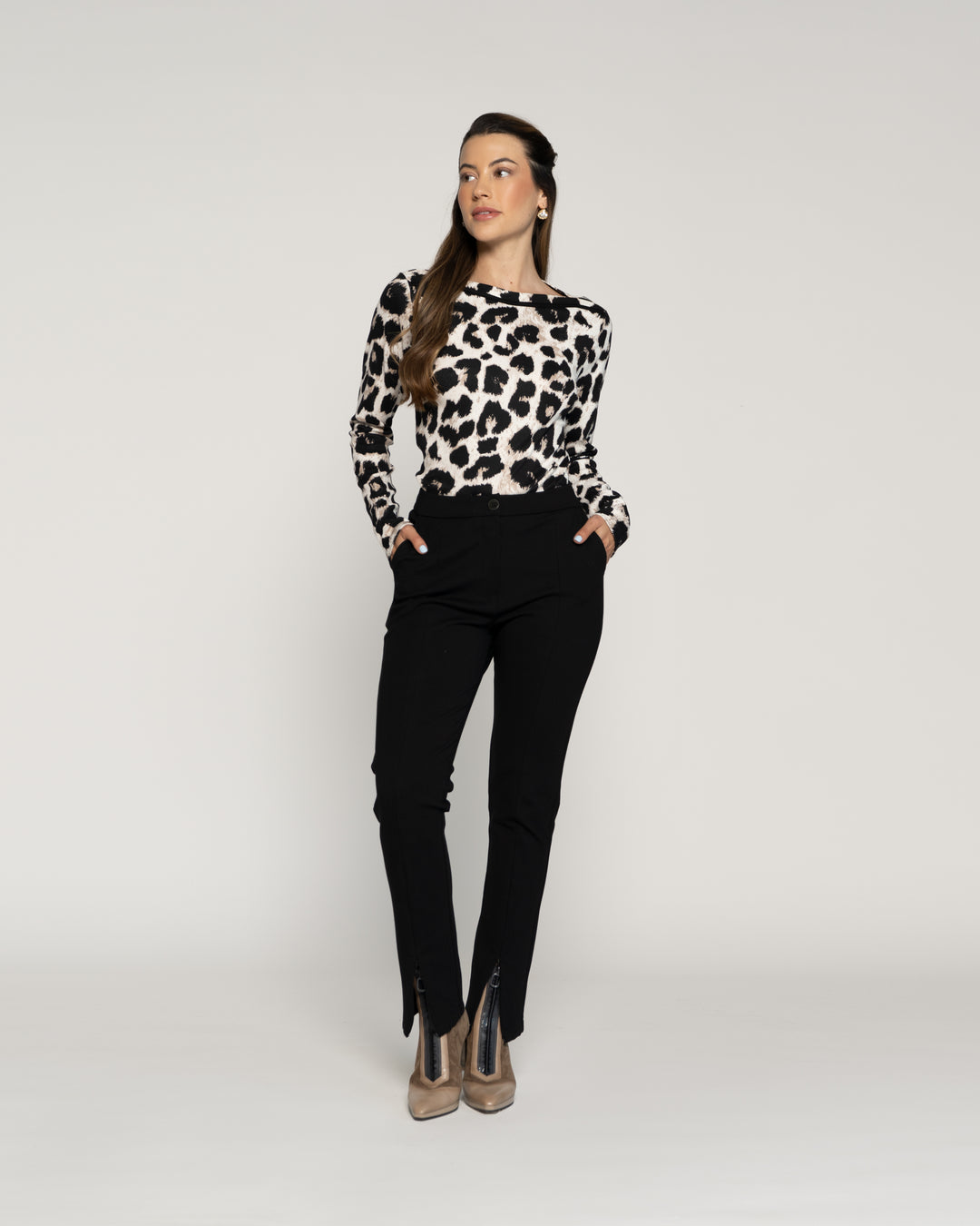 Polera Zoila Animal Print Cuello redondo Manga larga Ajustada Puño ajustado Mujer