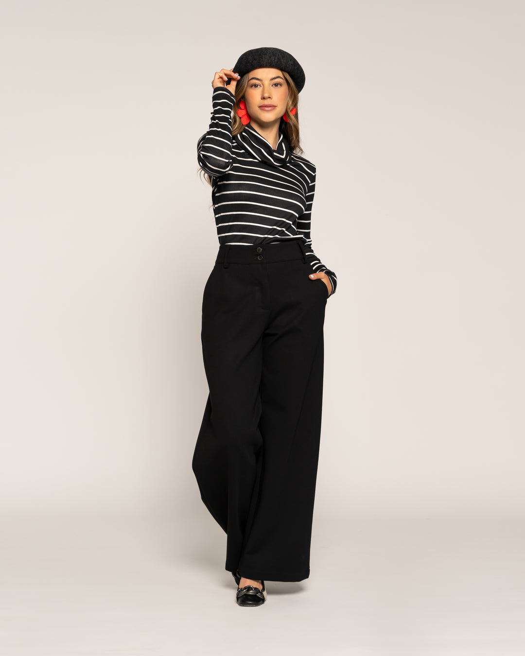 Polera Úrsula Negro Líneas Cuello suelto Manga larga Ajustada Puño ajustado Mujer