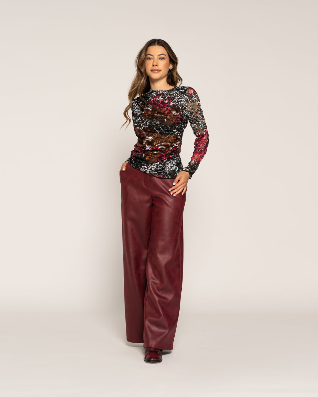 Polera Susana Vino Reptil Cuello redondo Manga larga Ajustada Puño ajustado Mujer