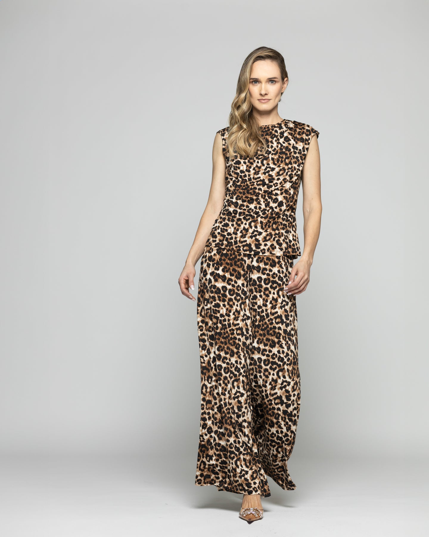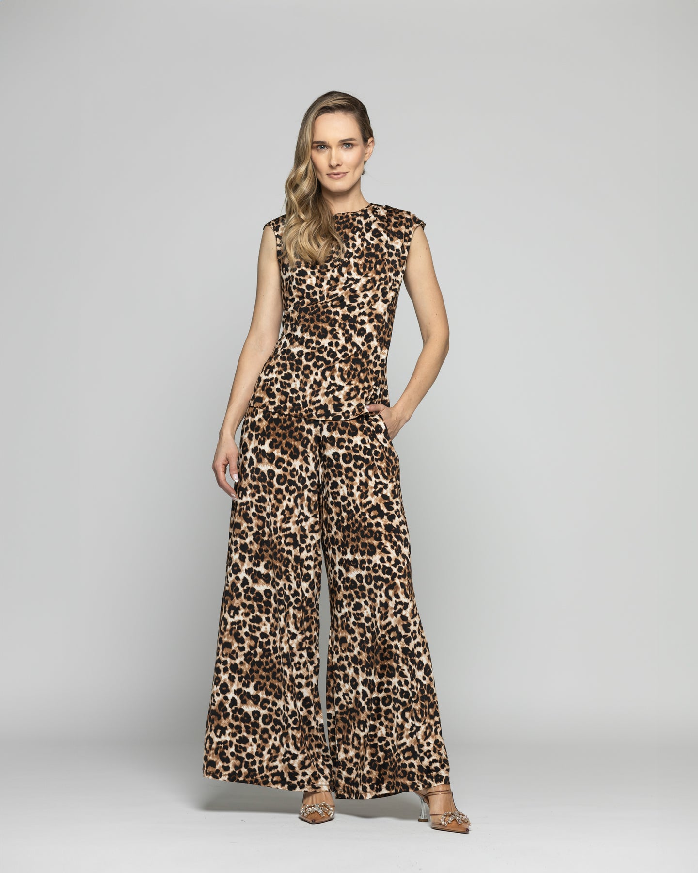 Una prenda que no pasa desapercibida. Esta polera sin mangas eleva cualquier look con su estampado de inspiración felina, ideal para quienes buscan una dosis de actitud y sofisticación en su vestuario diario. El diseño drapeado en los hombros realza la silueta y aporta un aire moderno, mientras que el tejido fluido y el calce recto aseguran comodidad y movimiento. Perfecta para usar con la falda o mezclar con básicos neutros que permitan al estampado ser protagonista. Atrévete con su conjunto de pantalón.
