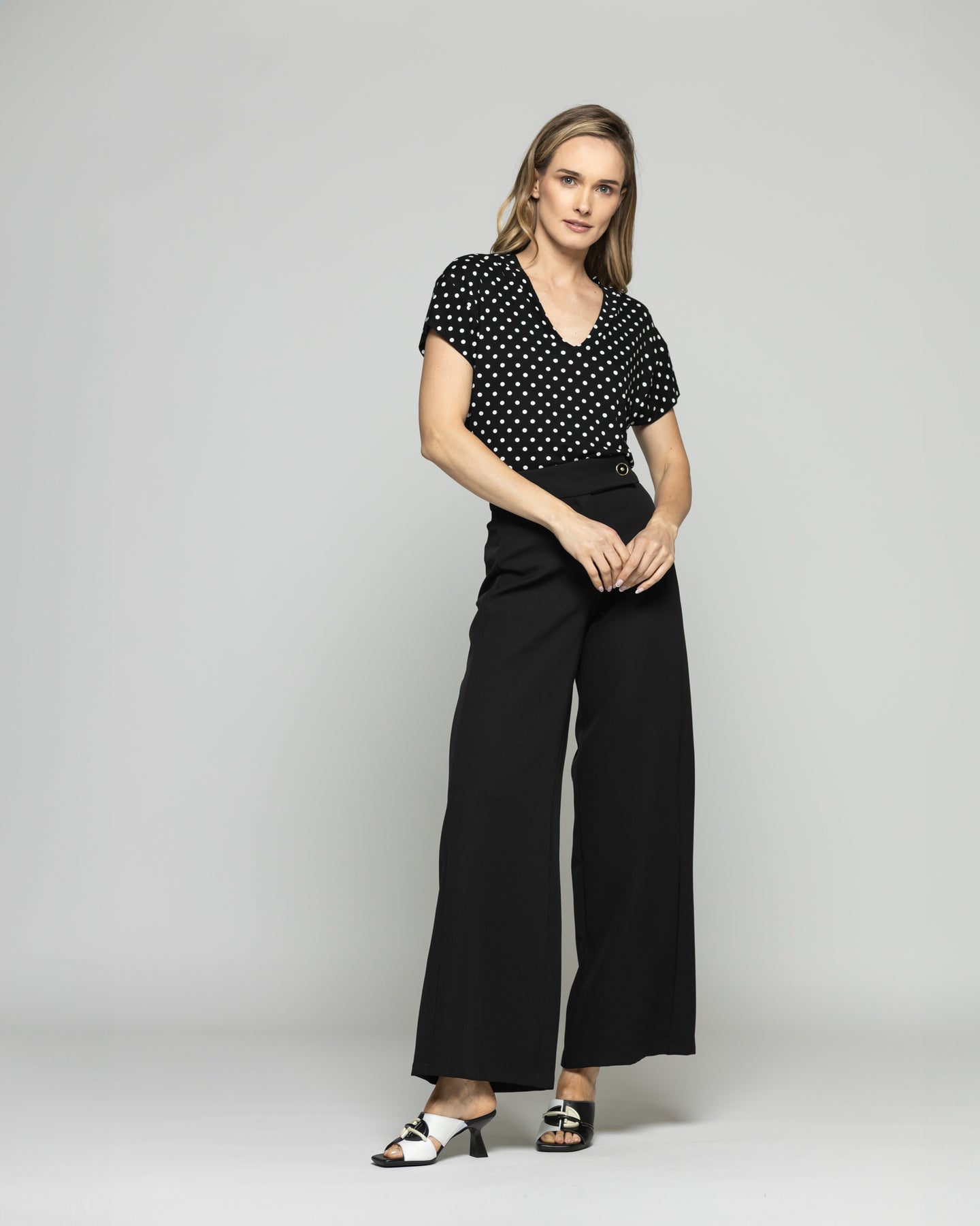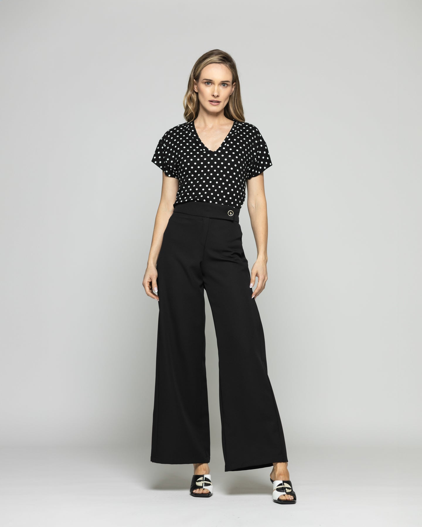 Un clásico atemporal reinterpretado con frescura y versatilidad. Esta blusa presenta un escote en V favorecedor y un corte relajado que se adapta con soltura al cuerpo. Su diseño de lunares pequeños (polka dots) sobre fondo oscuro aporta un aire sofisticado y juguetón al mismo tiempo, ideal para looks de oficina o combinaciones más informales. Las mangas cortas y la caída liviana del tejido brindan comodidad para el uso diario, mientras que su versatilidad permite llevarla tanto por dentro como por fuera de pantalones sastreros, faldas o jeans. Una prenda que equilibra elegancia y facilidad sin esfuerzo.