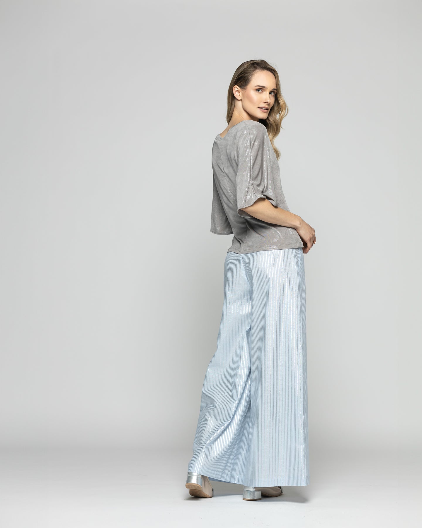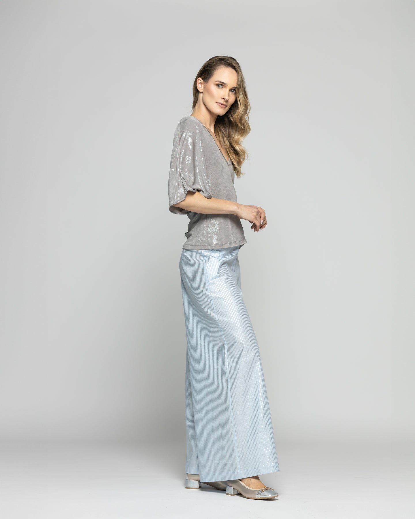 Con una textura brillante que captura la luz en cada movimiento, esta polera con escote en V es la elección ideal para sumar un toque sofisticado y moderno a tu clóset. Su tejido satinado crea un efecto visual llamativo sin caer en excesos, y el corte relajado con mangas amplias añade comodidad y elegancia en partes iguales. La costura central vertical estiliza la silueta y aporta un detalle sutil al diseño, mientras que su caída ligera la hace perfecta para outfits de día o de noche. Puedes combinarla fácilmente con prendas más neutras para que sea la protagonista o usarla como parte de un look monocromático con texturas contrastantes. Esta prenda es ideal para ocasiones especiales donde quieres destacar sin perder la comodidad que buscas en el día a día.
