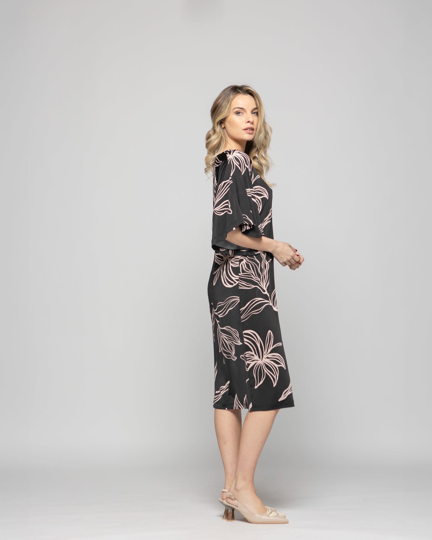 Un clásico renovado con un toque de fluidez. Este vestido negro estampado de corte recto incorpora mangas muerciélago que aportan movimiento y un aire sofisticado sin esfuerzo. El escote redondo y el largo midi lo convierten en una prenda versátil para múltiples ocasiones, desde reuniones laborales hasta cenas elegantes. Su caída suave y liviana envuelve la figura con comodidad y elegancia. Combínalo con tacones llamativos o accesorios dorados para elevar el look, o con sandalias bajas para un estilo más relajado y contemporáneo. Ideal para quienes buscan sofisticación con un giro moderno.