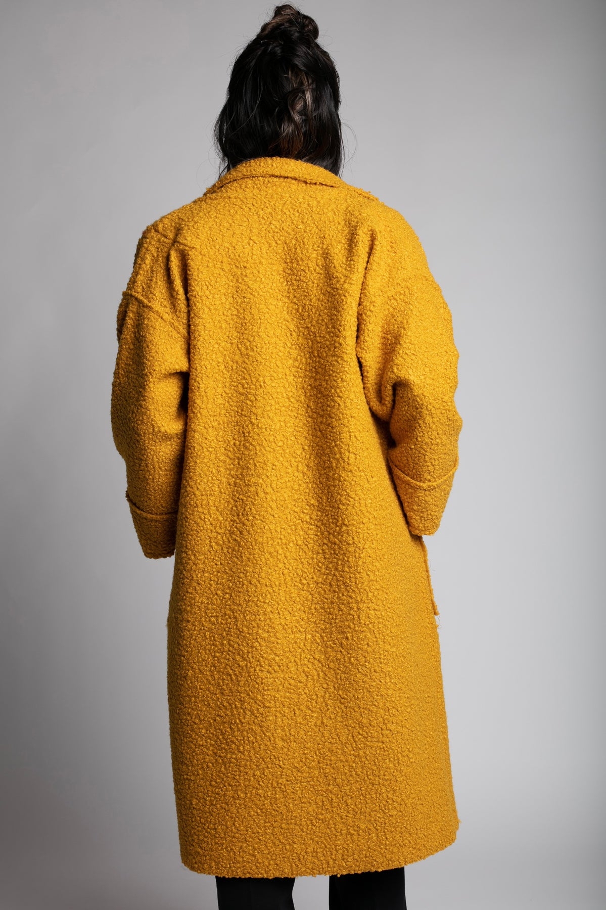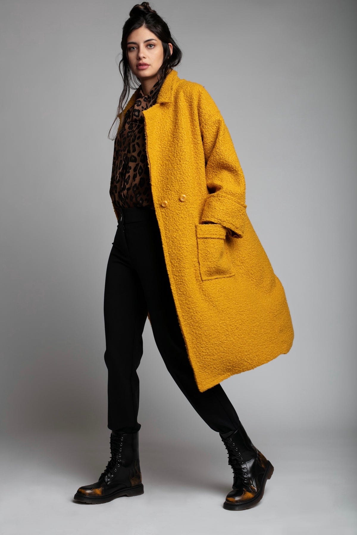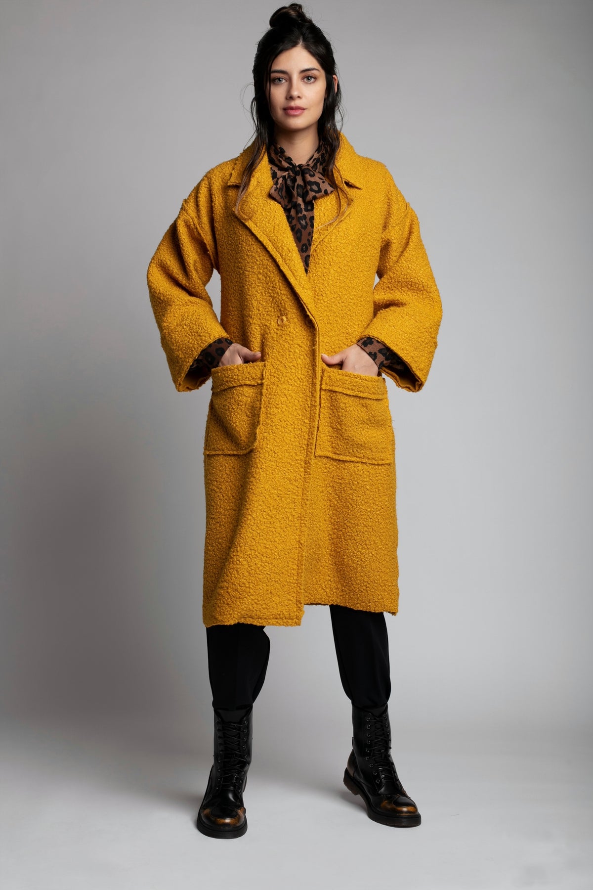 Abrigo bouclé con bolsillos delanteros, su textura y diseño aportan una capa de calidez y estilo a tus atuendos invernales, manteniéndote abrigada con elegancia.