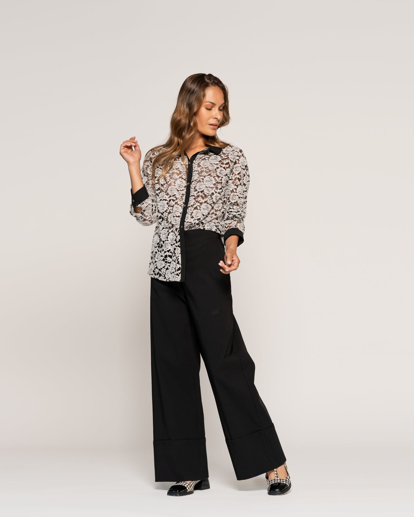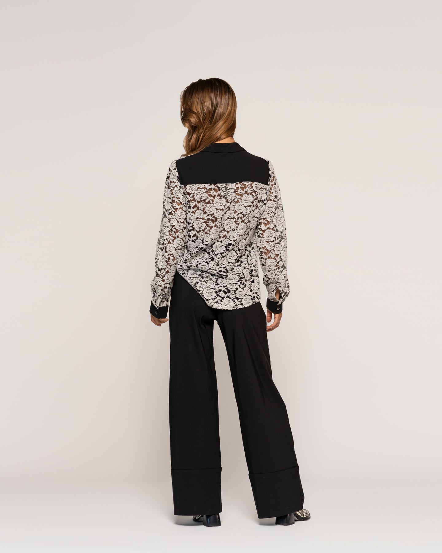 Blusa en tono tiza con delicado encaje floral bicolor y contrastes negros en cartera, cuello y puños que realzan su estética elegante y sofisticada. Diseño camisero de caída recta con transparencia sutil que aporta femineidad y ligereza visual, ideal para estilismos refinados de la colección CROMA Otoño Invierno 2026.